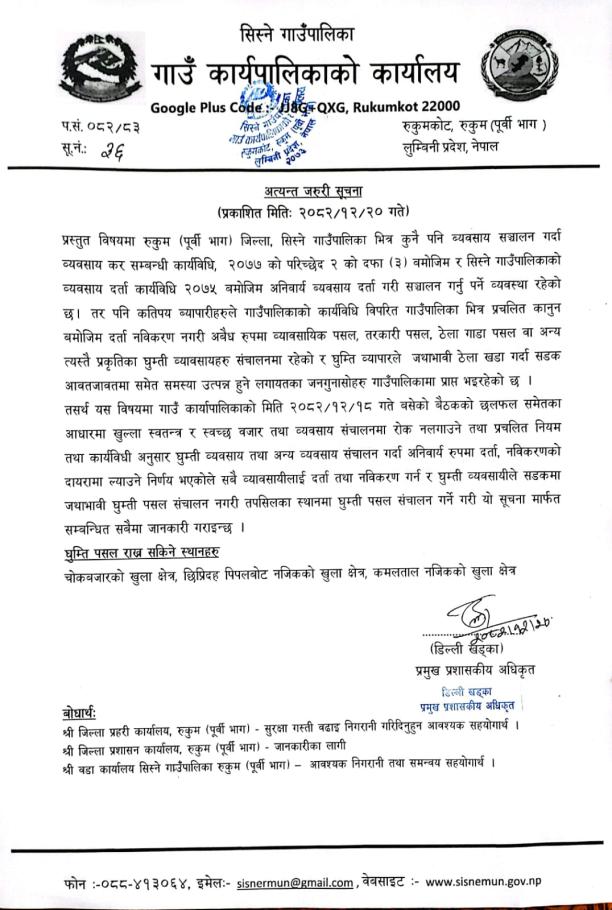 आ. व. २०८०।८१ का लागि सिस्ने गाउँ पालिका र रुकुम पूर्व जिल्लाको जिल्ला दररेट