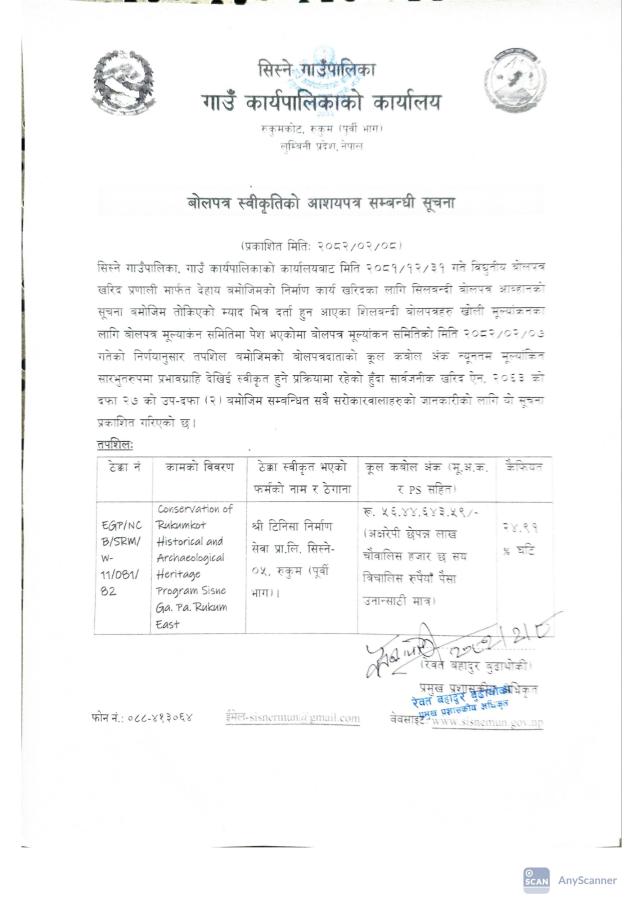 बोलपत्र स्विकृतिको आशयपत्र सम्बन्धि सूचना ।