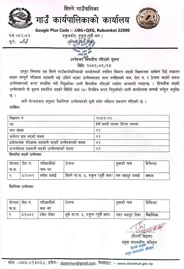उमेदवार सिफरिस गरिएको सम्बन्धि सूचना ।