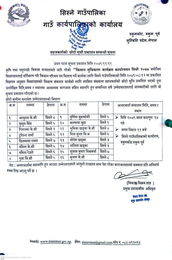 किसान सहजकर्ताको छोटो सूची प्रकाशन सम्बन्धी सूचना
